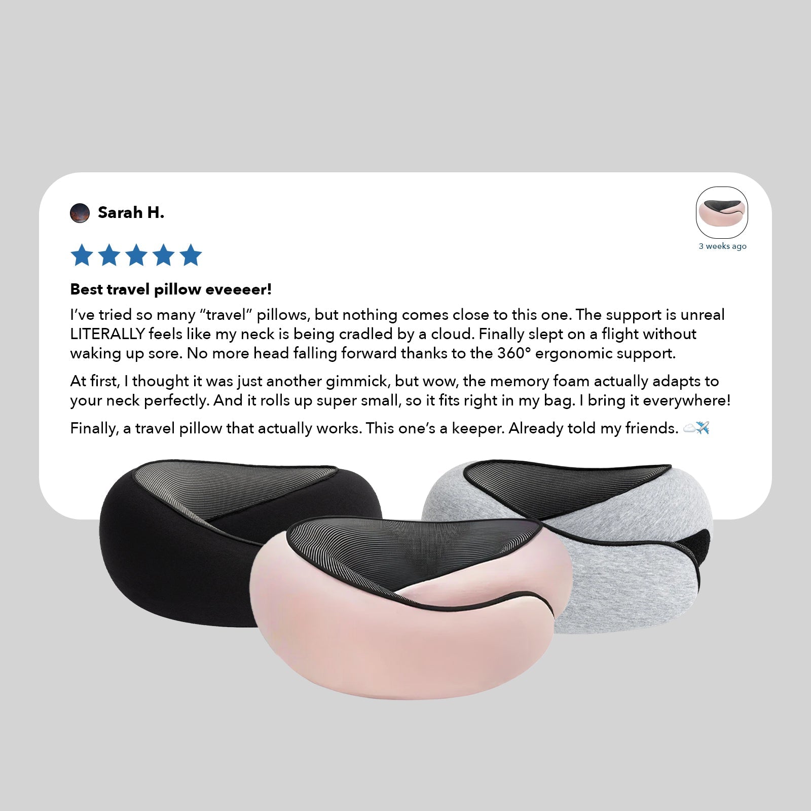 Our pillow is designed with 360° ergonomic support to keep your head upright and your spine aligned, reducing strain and discomfort during travel.