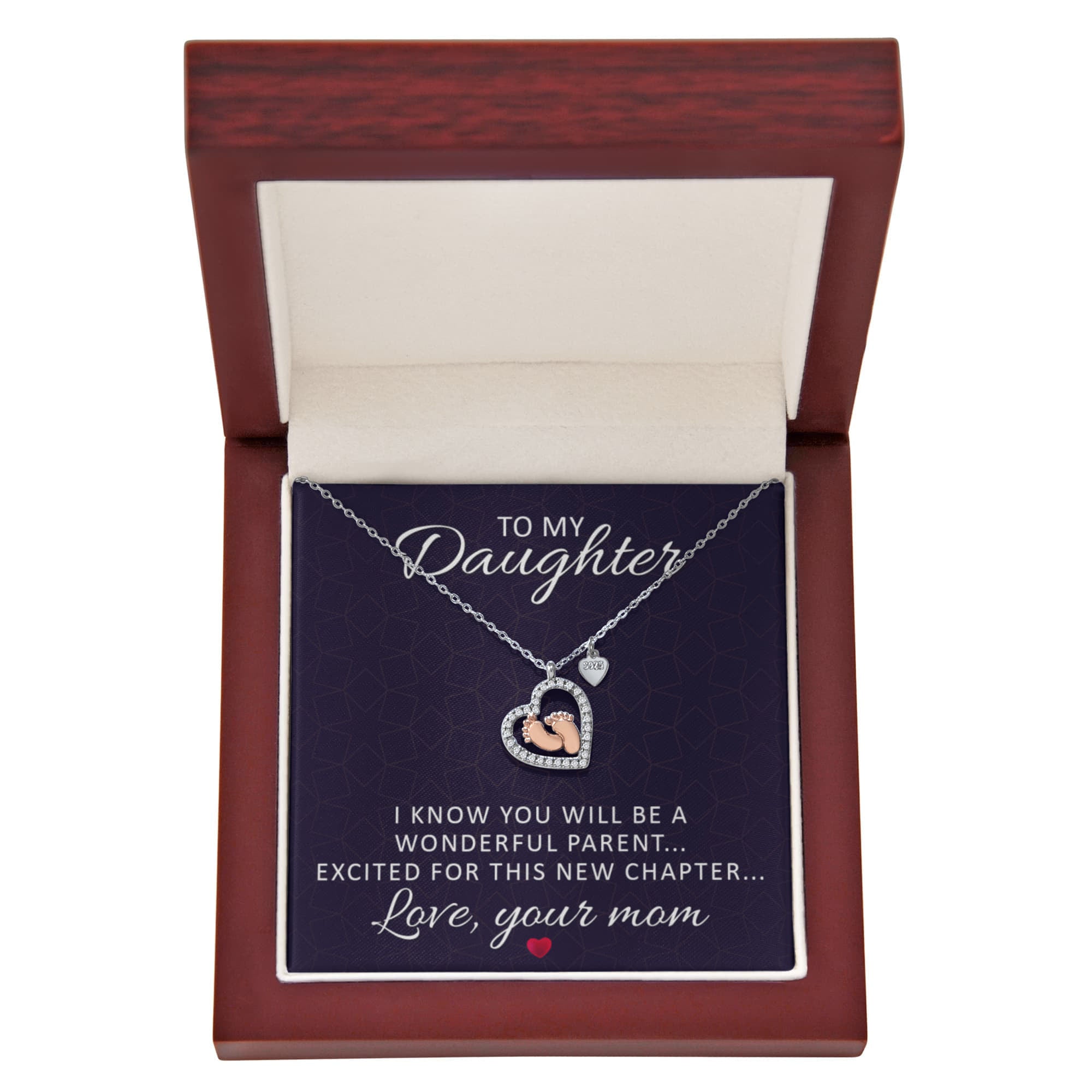 Imagine her reaction receiving this heartfelt symbol of love, family, and precious beginnings. The Baby Feet Heart Necklace features a sparkling heart-shaped frame adorned with shimmering cubic zirconia, surrounding a delicate pair of rose gold baby feet. A touching tribute to motherhood and new life, this necklace is the perfect way to celebrate a new mom, a cherished child, or a growing family.